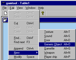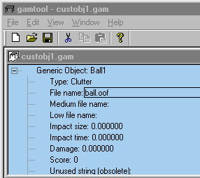 | Start up gamTool. When it opens it will start you off with an empty .gam file called Table1. Save it as Custobj1 into your working folder. Start a new PAGE for our object by going to Edit-New-Generic Object | Pick the + sign to open the branch. Dbl-click on "Generic Object" to change the object's name from 'New_Object' to 'Ball1'. That's the name that will show up in D3Edit's Object pallet. Leave TYPE as 'Clutter'. 'File Name' is where you tell it what polygon model to use. Make it 'ball.oof' as shown below. Save and close down gamTool. | |