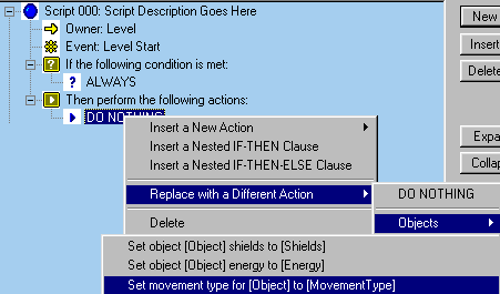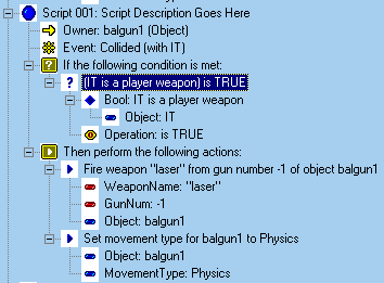 For the condition go to Insert New Condition-Binary Statement- Object- (IT is a player weapon) is True. All objects can shot or spew from their 'zero' point. You do this by specifying GunNum: -1. In the next tutorial I'll show you how to add gunpoints. At WeaponName spell out the weapon. You don't get a list to choose from. Add another action: 'Set movement type..." (same as at Level Start) and set Movement Type to "Physic" |