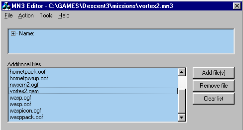 Just start the MN3 Packager and add all the custom .oofs, ogfs, .oafs and the custom .gam file using the Add File(s) button. You do NOT need to add a level or set up any mission information. Save it as anything you like. I'm using my .mn3 from vortext2 as an example but you could name it Custom.mn3, Temp.mn3..... whatever. Remember that this isn't your FINAL .mn3, it's just a temporary .mn3. |