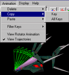 You can even copy all the keys of a Sub-Model at once and paste them into another oof. Turn on View Rotator Animation to check rotate property setting. View Trajectories show you the path a Sub-Model traveles in a frame. |