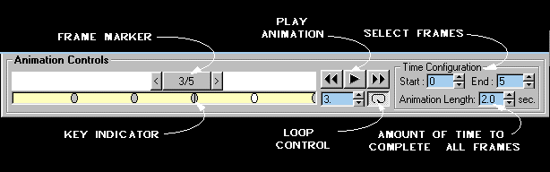 | Above is the Animation Controls toolbar. Set Time Congiuration for the frames you want to play, Animation Length for the amount of time and hit the Play button. You'll also use Time Configuration to add frames. The key indicator tells you whether or not the selected Sub-Model has an animation key in that frame and is also used in the Copy/Paste process. |