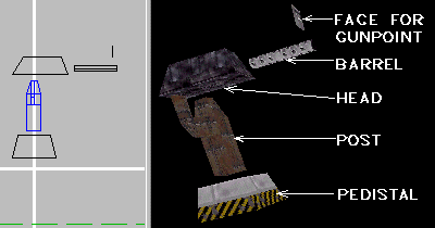 I have 5 separate pieces. The Head and Post will be the 2 moving pieces. I'm keeping the barrel separate from the head in case I decide to add animation for it to recoil (not part of this tutorial). There's an independent face for me to convert to a gunpoint (Remember - Plan Ahead). |