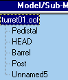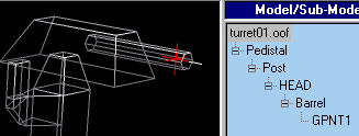 This tree shows one of the most important points in building a turret. GNPT1 is not only going to fire the weapon, it is also the "Aiming Gunpoint" (spec'd in the .gam). The "Aiming Gunpoint" MUST be a subordinate to the sub-models that move. When GNPT1 tries to aim, it tells the sub-models ABOVE it to move. GPNT1 could have been child to Head or Barrel as long as it was subordinate to Head. |