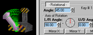 | With LeftHandle selected and the Frame Marker at 0 go to the Animation Tab and pick Rotational. This tells The oof that the sub-model has a Rotational animation key at 0. You'll see an oval appear at the left end of the Animation Bar. The oval tells you that the selected sub-model has an animation key at that location. Advance the Frame Marker by clicking the > button. The Marker should now read 1/3. Put a Rotational key there. Finish with LeftHandle by assigning a Rotational key to 2/3 and 3/3. With LeftHandle still highlighted your Animation Control should look like the one below. |