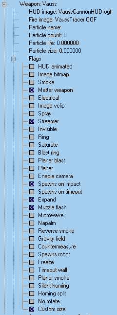 Fire Image: The "shot' the that is seen leaving the ship (oof. ogf, or oaf) Particle name: Particles dropped (trailing) behind the fire image (usualy a weapon) ex. "plasma sparks" - the green spark behind a SmartPlasmaHomers Particle Life: How long the particle exists for. Particle size: ? Hud animated: ? Image bitmage: The fire image is a bitmap (ogf). ex. The omega Smoke: Smoke blobs drop behind the fire image. ex. concussion missle Matter Weapon: Weapon is a physical object ex. vauss, conc. Missle (req'rs ammo) Electrical: Electrical Storm weapon (Omega) Image Clip: The fire image is a video clip (oag) ex. Napalm gun (flamethrower) Spray: The Weapen is a spray ex. flamethrower Streamer: Streamer effect (streak) trails weapon. ex. streaks behind frag particles Invisible: Weapon is invisible. For a Gunbouy an Inv. weapon is dropped then spawns the gunbouy. Ring: Weapon is drawn ring style? Saturate: Saturate this bitmap weapon? Blast Ring: Creates a Blast Ring upon explosion? Planar Blast: Blast Bitmap takes on wall plane (stays flat planar to the wall, turn off, the blast image always faces you.) Planar: The weapon doesn't always face you. Enable Camera: Camera view from the weapon. ex. Guided missle Spawns on impact: Spawns a Weapon when if hits an object. ex. Smart Missle Spawns on timeout: Spawns a Weapon when life ends ex. Cyclone Expand: Weapon's explosion image expands (grows) Muzzle Flash: Flash produced at the gunpoint the weapon is fired from Microwave: Weapon produces Microwave Effect on Objects Napalm: Napalm effect on objects Reverse Smoke: Smoke trail gets smaller. ex shrinking rings of Microwave Gravity Field: Creates a gravity field (BlackShark) Countermeaser: It's a coutermeasure Spawns Robot: Spawns a robot instead of weapon ex. Gunbouy Freeze: Slows hit player. Timeout wall: I wall hit ends like a time out Planar Smoke: Planar smoke trail instead of blob ex. Homers and Smarts No Rotate: This weapon does not rotate as a bitmap? Custom Size: Uses Custom Size? |