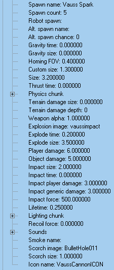 Spawn Count: Amount spawned (in this case 5 sparks spawn upon ompact) Alt. Spawn Name: An alternative weapon to spawn. Alt. Spawn Chance: Chance (0 - 100%) that the alternate weapon will be spawned. Gravity Time: How long to create a gravity field (see BlackShark) Gravity Size: How big of a radius is the gravity field. Homing FOV: Cosine of the Field of View for homing weapons. Custom Size: Custom size of weapon (to override polymodel size) Size: Weapon 'blob' size. Thrust Time: How long this weapon thrust is on. Physics Chunk: Physics settings (I'll show seperately) Terrain Damage Size: Radius of terrain damage this weapon does to the terrain Terrain Damage Depth: How deep is the damage on the terrain Weapon Alpha: How alpha'd the weapon is (0 to 1.0, 0 being transparent) Explosion Image: D3 Texture Name (.gam) of the texture to use when the weapon explodes. Explode Time: How long the explosion image exists. Explode Size: Size of the explosion Player Damage: How much damage this weapon does to a player. Object Damage: How much damage this weapon does to a generic object. Impact Size: The radius of the sphere used when the weapon impacts and explodes. Impact Time: How long the impact affect lasts. Impact Player Damage: How much damage the impact explosion does to a player. Impact Generic Damage: How much damage the impact explosion does to a generic object. Impact Force: Amount of force caused by the impact explosion. Lifetime: How long the weapon lives It "TIMES OUT" when lifetime ends. Recoil Force: Recoil applied at release (Mass Driver or Mega) Sound Name: D3 Table Sound (.gam) name of the sound associated with this sound slot. Smoke Name: D3 Texture Name (.gam)of the texture for the smoke trail image Scorch Image: D3 Texture Name (.gam)of the texture for the scorch mark left by this weapon. Scorch Size: Size of the scorch mark to leave Icon name: Weapon Image (32x32) shown when HUD is NOT a cockpit |