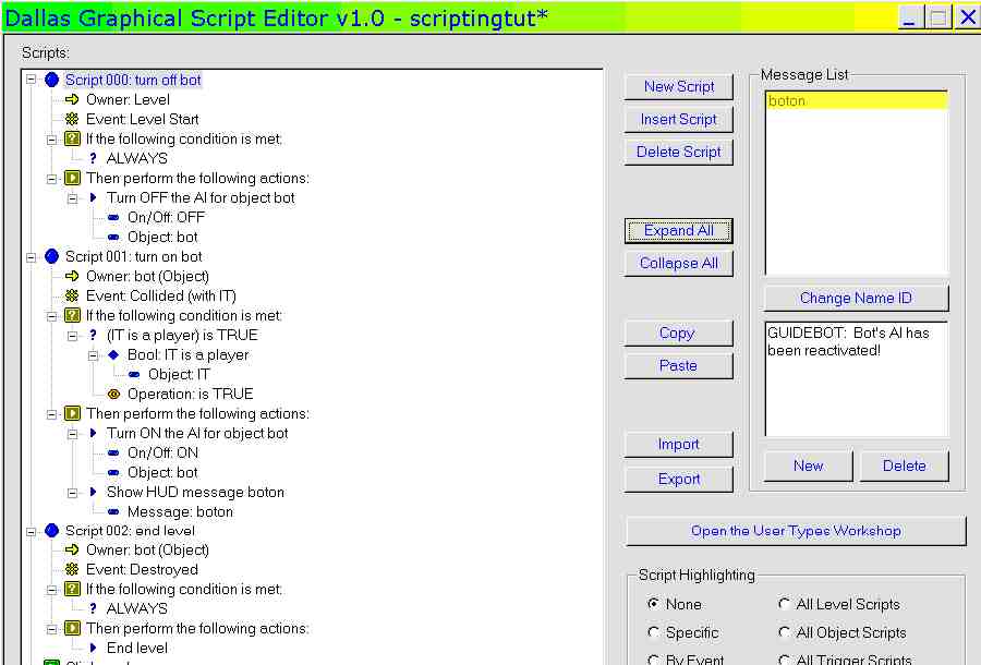 There is an easily labeled button for this in the upper half of dallas. Name the script "turn off bot." Set the owner, by right clicking on it, to level. Set the event to "level start." Set the condition ("if the following condition is met") to "ALWAYS." Finally, set the action to "replace with a new action">"AI">"turn [ON/OFF] AI for object {OBJECT}." This action is pretty self explanatory. If an action or query ("when this is so") is a bit harder to understand, look at the bottom of dallas. There is a box that contains information about the currently selected query or action. The action you just added should already be expanded. Right click on the variables that are in it. For this one the defaults are "OFF" and "None." Change the "None" to "bot" by right clicking again. (to change about any variable or such, right click on it). This is your first script. What it does is when the level starts it will turn off the AI (AI makes objects do things, all object that are not power ups have AI, not just bots) for bot. Now that bot will just sit there and make noise, we need to make a way to turn him back on.