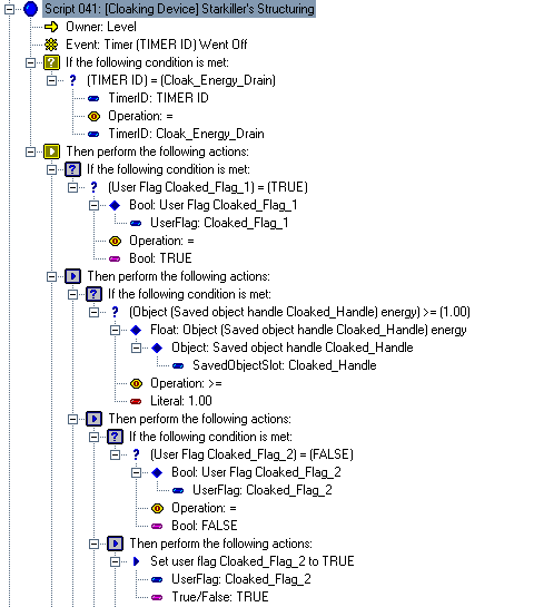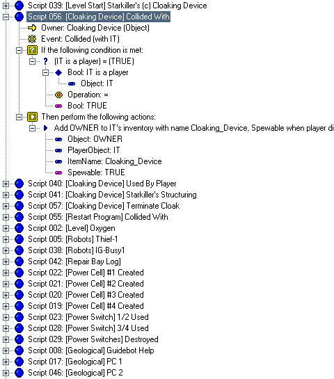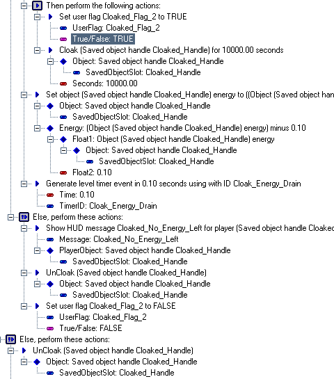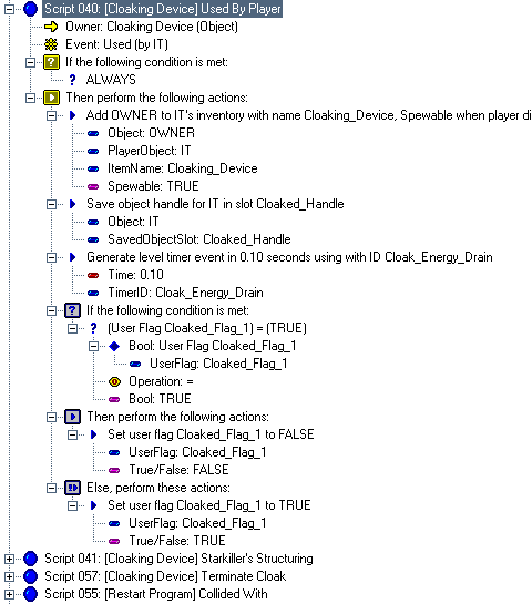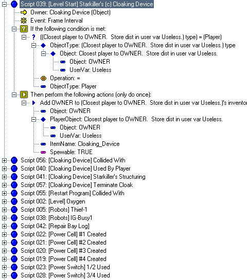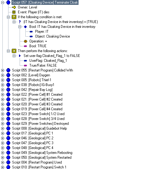 This script was not for this site, but for Skyalmian for his project "Lunar Outpost MN0012" when he needed a cloaking device for the ship just like the one in the novel Descent (although, the DALLAS screenshots are from his script for his level Space Station Kreathlan, where he employed the use of the Cloaking Device when it didn't make it into Lunar Outpost MN0019). This script is extremely advanced and not for beginners in the slightest, so everything will not be explained (it is assumed you know how to fully operate DALLAS). Skyalmian had a difficult time trying to duplicate this in DALLAS when it was given to him. This so-called tutorial will show you what should be done to create a Cloaking Device powerup that can be used by any ship and will explain in general what each script does. Overall, it should take between 30 minutes to 1 hour, depending on how well you can operate DALLAS. 01 - The very first thing you should do once in the Dallas Graphical Script Editor is open the "User Types Workshop" and create the following user types: The Cloaked_Handle is the identification of the player ship holding the device, the Cloak_Energy_Drain is for the timer used to drain the ship of energy using the Cloaking Device, the Cloaked_Flag_# are critically important for states of cloaking, and Useless is only necessary to fill in a blank space for the first script. 02 - Create these messages in the Message List (name -> text string): 03 - Create a powerup in the level with the name Cloaking_Device and put it close to if not on the first player start. Pick a good, suitable object, as people will see the model when the player holding the Cloaking Device dies. Skyalmian for his version chose the model Data Cartridge. 04 - Create a level start script that is executed upon level start. In it, "Set user flag Cloaked_Flag_1 to FALSE". 05 - Create the first script; duplicate the expanded script selected. This script automatically gives the object Cloaking Device to the nearest player's inventory at level start with the name "Cloaking Device" and with the object spewable at player death, lest the object be lost forever when the player dies. Note: if you wish, you can skip this script to have the Cloaking Device be found in the level by the player instead (in which case, delete the UserVar Useless, as it will not be needed). 06 - Create the second script; duplicate the expanded script selected. This script adds the Cloaking Device powerup to the inventory of whatever ship touches it, with the attribute of being spewable upon player death. 07 - Create the third script; duplicate the expanded script selected. This script is for when the player activates the Cloaking Device. When activated, it re-adds the device back to the inventory, lest it be lost, gives the player ship the Cloaked_Handle identification, starts the energy drain timer since the device is now On, and sets the Cloaked_Flag_#s necessary for the device's operation. 08 - The fourth script is the most difficult of them all, as this operates the Cloaking Device. This is divided into multiple pictures, as it was not possible to create a snapshot of the entire script. In the first image the title of the script is highlighted. In the subsequent images, the last line of script shown in the previous image is highlighted so as to keep track of where you left off. For example, in Stage 2, the line "True/False: True" is highlighted because that was the very last line in Stage 1. Also, in Stage 2, the windows was scrolled to the right a bit to show what one of the more lengthier lines of script does, the one that subtracts 0.10 energy from the player's ship. Even though the first main line of text is cut off (the top expandable tree line), it is still possible to know what the line would say after analyzing the script lines below it. 09 - With the most difficult script hopefully finished, there is one left. Duplicate the expanded script selected. This script turns the Cloaking Device Off when the player dies. 10 - You're finished; 6 scripts total, counting the Level Start script that sets the important flag "Cloaked_Flag_1" to FALSE. One thing you can do to tweak the script is change the "Float: 0.10" value in Stage 2 of Step #08 to a higher or lower number. The higher the number, the faster your ship's energy will drain. If you set it to 0, no energy will be lost, but that would make the timer pointless. If you know how, you can strip the timer from this script so that the Cloaking Device simply enables/disables the cloak without any loss of energy or unnecessary script code. Although, heh, no one would ever turn the silly thing off...