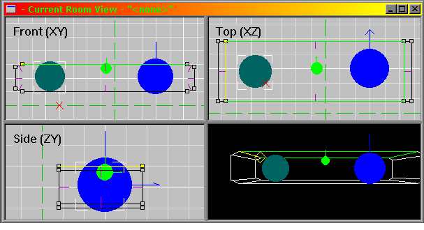 | Take the default room and stretch it out to about 100 units wide. Place a powerup (any powerup will do) at the right side of the room (from any angle, just make sure you remember where you put "right"). Name the powerup "to here." Place a clutter object (any one of reasonable size) to the left of the room. Name it "teleporter" and make sure there is about 50 units of space between the clutter and the powerup. | |