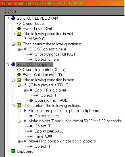 Now We Script Open up DALLAS and place a blank script. This will be the level start script. Have it so when the level starts it ghosts the "to here" object. That way you don't pick up the powerup when you teleport to it (you may want to change that in certain levels).Make a new script, this one will do that actual teleporting. Name it "teleporter." Set the owner to the clutter object teleporter. The event should be collided with [it]. Have the condition define [IT] so that [IT] is a player. Now the trickier part. The actions must be in order, or the script might not work correctly. First, go under the objects area of the scripting actions and select "store [object] position in position clipboard." Set the object to "to here." |