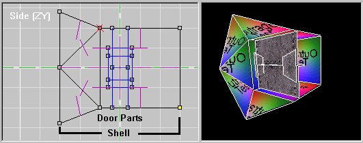 First, build and texture your door and its shell in D3Edit (The shell textures don't matter yet; you'll be able to change them after you add the door to your level). When building the door, make sure that parts you will want to move do not share any vertices with the shell or any other moving parts. Arrange the door's parts so that the door is closed and is halfway between the front and back of the shell, because D3 seems to "fix" doors that aren't at the halfway point.