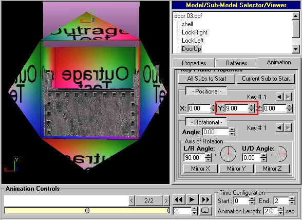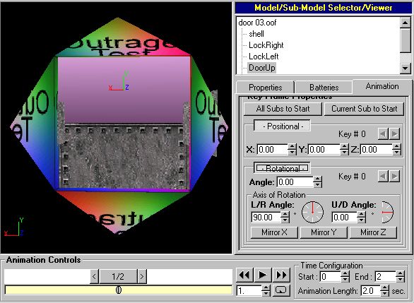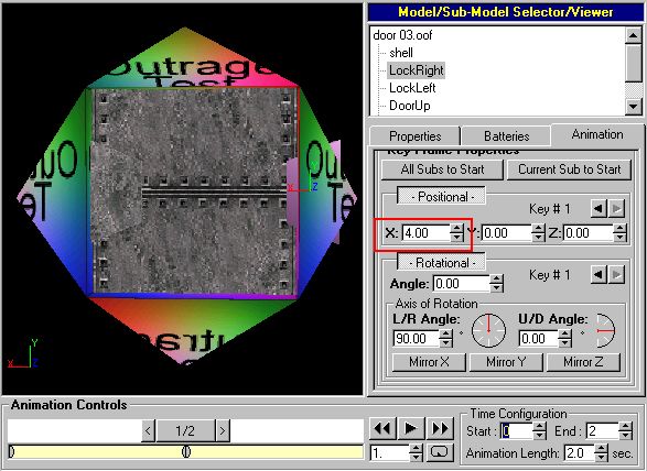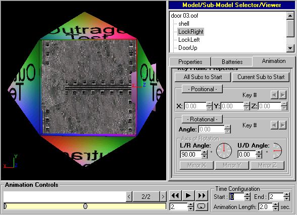 Now you can start setting animation frames for your door's various submodels. Select one of the "moving parts" submodels and click on the "Animation" tab. For each keyframe, if a submodel starts moving, stops moving, changes speed or direction, or changes the rate at which it is turning, you must select both "-Positional-" and "-Rotational-" under "Key Frame Properties." (If you don't select both of those, your door may pop open instantaneously in D3 instead of animating open.) If that didn't make sense, look at the example and it should. I'll start with the submodel called "LockRight."