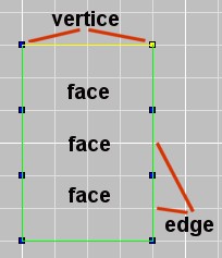 Ever play "connect the dots"? You know, the puzzle where you connect a series of numbered dots with straight lines in order to make a picture? D3Edit utilizes this concept with a number of its functions, one of which is creating faces. You simply place the "dots", or vertices on the screen and boom - D3Edit connects these "dots" in the order you placed them, creating a polygon, or face. The lines in between the vertices are edges. A face is a series of verts
