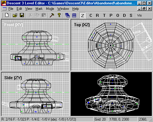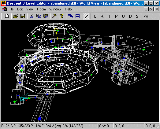 or Room Editor View. This is where you will do the majority of your work. Room View is where you can create faces, rooms, apply textures, and place objects. There are four separate panes in this window. Three of these panes are 2 dimensional views of the current room - one is a top view, one a side view, and the third is a view from the front of your room. The fourth pane is a 3D view similar to the one in World View, however only the one room is shown, rather than the entire level. The little colored dots in the pic are objects, mostly powerups and player start points. I removed the vertices from view so the room could be seen easier. (Ex. a still has the verts shown). This room looks complicated at first glance, but it actually only took me about 3 minutes to create the main shape. And this was my very first room! |