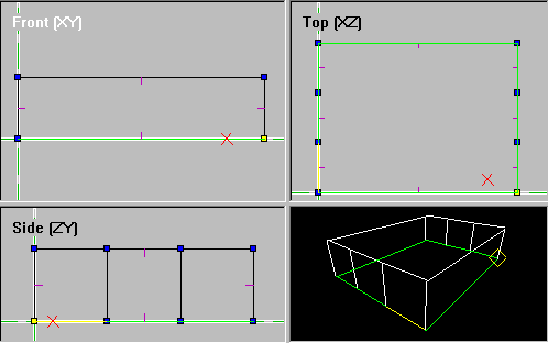 Using the mouse and the Insert key place the remaining verts exactly as in ex. d. Place them in a clockwise pattern and in numerical order (as numbered in ex. d - this is VERY important!). You may need to use the view pan and zoom functions to position the pane so that all the verts will fit in view. If you misplace a vert, just hit the delete key and start again. After you have placed the 8 verts, enter face mode (use Mode/Face or ctrl + F). Press the Insert key. A highlighted green square will appear along the marked verts - this is your first face! The green lines signify that this is also your current face. Notice that all the verts are no longer blue, or marked (not shown in ex d). Your room should measure 160 x 120 units. Since we placed our first vert at 0, 0, 0, this would mean that vert #5 should be at coordinates 160, 120 - verifying the size of the room. ex. d If your face turned out wrong, it can be deleted. In face mode, click on the face until it is outlined in green. Go to the Mark menu and select Mark/Unmark. Now click on the grid, but outside of the face. Notice that the face is now outlined in blue. This means that the face is marked and can be manipulated. Hit the Delete key and watch it disappear. Verts and faces can be marked and deleted, in their respective modes. Faces and verts can also be marked by left-click-holding and dragging a box around all faces or verts you want selected. Ok now let's rearrange the screen so that our face can be seen in all three of the 2D panes. You must click inside a pane before you can move it or edit in it. A pane is selected when the pane "title" is white (the Top (XZ) in ex. c & d and the Front (XY) in ex. b). You can see in the Front and Side views that a short purple line is sticking out of the face. This is the normal and it shows which direction the textured side of the face is pointing. Right click in the 3D view and select Center Current Face. If nothing happens, make sure that the face is selected in the 2D panes (green outline). When you have the face in the 3D view, right click again and select Textured with Wireframe. Use ctrl + left mouse to rotate the face. Note that one side has a colorful texture, while the other is just black. Extrude ex. f The Extrude Face(s) dialog box is shown in ex. f. Fill in the options so that it looks like ex. f. The first option, Extrude From:, is where you select which face(s) you want to extrude. For a face to be current it must be outlined in green. You can also mark one or more faces and extrude from these. We only have one face, so the choice is pretty easy :) Distance is the number of units we want our extrusion to span. Our extruded room will be 40 units tall. This number can be negative for extruding the opposite direction. Extrude Along is the axis along which you want your extrusion to follow. Determining the extrude axis can be tricky for the novice 3D modeler. We made our face using the Top view. The Top view only represents two dimensions, X and Z - X = horizontal, Z = vertical. We don't want to extrude in either of these directions. Since this face will end up being our floor, we know that we need to stretch the room away from this face. The extrude in this view would come towards you and out of the screen 40 units, which is, of course, impossible. Since we know we can't extrude along either axis in this view, and since this view shows X and Z, then by process of elimination we know that Y is the axis to extrude along. To prove it, look at the Front view pane. This shows the X an Y views ex f. We are now looking at the "floor" of our room from floor level. Notice the normal (purple line) is pointing up the Y axis - that's the textured side of the face. We will extrude in this direction in order to make our room. New Face Normals determines which direction the textured side of you face will point. They should point inward so we can see the walls from inside the room once extruded. Delete Base Face after extrusion will delete the face you started with once the extrude is complete. Since our room needs a floor, we'll leave it unchecked. Use Settings as Default can be checked or not, doesn't matter for us. Once everything is set properly, click the Extrude button. The result should resemble ex. g. ex. g Congratulations - you have successfully constructed your first D3 room!!! Save this room now and call it "room1.orf" - you will use this room in the next tutorial. D3Edit has a nasty habit of crashing as of this writing...you can't save too often. If you view the room in the 3D pane as textured, you will see that the room has been "painted" in that butt-ugly multicolored pattern. We will fix this in the next lesson. For now, celebrate the fact that you have