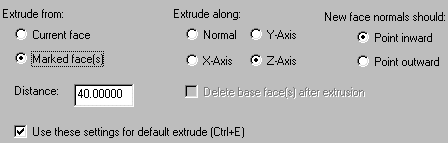 With faces marked, set the extrude for 40 units again and extrude. We couldn't use the Delete base face... option so some unwanted faces are left behind. These are the faces we just extruded from and they are still marked! Select any of the 2D panes and hit the delete key. That will take care of at least some of our unwanted interior faces. We will do 3 more extrusions in the same manner as above with the only variation being the length of the extrusions. Follow the following list - since we made 2 extrusions already, we will start with number 3: 3... Extrude 5 faces 80 units up the Z axis 4... Extrude 5 faces 80 units up the Z axis 5... Extrude 5 faces 40 units up the Z axis |
