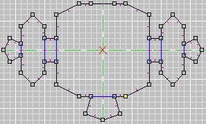 Sometimes you just can't make the shell you want with a single floor or wall face. So you have to use multiple faces. This is a dangerous process if you don't know what you are doing, in the sense that you can create T-Joints left and right, and fill your level with errors. You always want all your room shells to be airtight and error free to eliminate the risk of crashes or other problems during games. So let's go through the process of making an error-free shell with multiple extrusions. You have to plan carefully so that you don't create any T's, which will leave holes in your shell. Check out this vertex pattern. ![]() Now I'm going to make the other faces separately, just to show the pieces and how you have to match up the verts and the edges. ![]() The reason you have to do so many of these faces to get this room shape is because you cannot have any concave faces. So you have to think of the shape you want, then break down the floor into as few faces as possible without having any of them be concave. Also note the yellow edge on the current face: that edge HAS to match exactly with the pentagon face's edge, because that will be a shared edge on the floor, and unless its an exact match, you've got T's and a bad shell. Now I'm going to move all the faces together into their proper places and extrude. (On another note, see the grid? That's a 10 grid, not a 5. You can zoom out on the grids, by panning with the mouse, if you need to see your whole room, and you can zoom in really close if you are working with tiny grids and can't see what you are doing.) In current versions of the editor, you can extrude from all these faces at one time, by clicking "Extrude from: Marked Face(s)" in the extrude dialog. Then bang, it will extrude them all in one shot, to the same length. If you are still working with 0.9 beta version, you will have to extrude them one at a time. Here's a look after extruding. ![]() Do you see the block on the far right? It extruded DOWN instead of up. Oooops. Don't let this happen to you! Make sure you always lay your floor verts in a COUNTER-CLOCKWISE circuit when making floor faces, so your normals always point up. And check before you extrude to make sure you remembered, and that no normals are pointing downward. If by chance you do have one or more pointing downward, then you've got to unmark ALL the faces, mark the ones that are facing wrong, flip them, then remark all the floor faces. Yum. It's also a good idea to NOT "combine" your verts prior to extruding. There's plenty of time to do that once the shape is right. If you combine the verts, you can't move the extruded blocks around independently. They will have been attached, and moving one will cause distortion in others, like this: ![]() Now in current editor versions you can move marked faces around in face mode. So that move COULD have fixed the problem you see here IF the verts hadn't been combined. So don't go removing duped verts until the shell is done, THEN do it. And don't forget to! You can cause massive errors if you fail to combine verts to seal up those shared edges! Now let's look at the room as it is meant to be: ![]() We are not quite done yet. There are some faces between the segments that need to be removed to open this thing up into a single area. You can do this best in top view. First make sure you are in face mode, then unmark all faces, then use the mouse to click and drag over JUST the faces you need to remove. Do it along each seam, one seam at a time. When you have all the seams marked, it should look something like this: ![]() Make sure you didn't accidentally mark any of the soon-to-be shell faces. You only want to delete the seams between extruded segments. Once they are all marked, press the delete key or choose Delete from the Edit menu. NOW your shell is done, and you should Remove Extra Verts to seal all the edges. And there you go: a non-bland non-boxy room made entirely with Extrude. ![]() Texture as desired. Then your shell is complete and error free, and you can begin to populate it with nonshell faces. ------------------------------------------ One other note: This example room is *JUST* an example. I would not actually DO this layout this way if I wanted to use this in a level. Rather, I would have this be three rooms, since those wing areas on the sides will not have line of sight to most other rooms. Those should be rooms unto themselves. So this example room should actually be three rooms: the middle and the two wings. And this would save you a little time, as well, because you could do just one of the wings as its own room and use that room twice when you assemble all your ORFs to make the D3L. Now that's not the main reason to break this into three rooms. The main reason is because that would be best in terms of the Vis table and the game engine, and optimizing your level's performance. But the fact that it would also take less work is a nice bonus. I hope this lesson has been valuable in showing you how you can use extrude to do more than make simple boxy rooms, as well as how to do it without creating errors. Next lesson: multiplanar extrusions. More to come... ADDENDUM - Texture Alignment With the 0.9 beta editor, texture alignment is a tedious process. You will have to align the faces manually, one at a time, if you need to realign things once you're done extruding. One thing you can do in this case is a simple step by step process to cut down on the work: 1) Select a face to align 2) Click the middle button to reset the face to "default UVs" (this eliminates the warpy twisty effect you get when you move the verts, or when you bend - if you don't want the textures bent with the verts, you have to reset them afterward). 3) Align the texture, eyeballing it in the 3D view in textured rather than wireframe. Take note of the U and V numbers. 4) Go to a similar face that needs to be aligned the exact same way, reset UVs with that middle button, then enter the numbers from