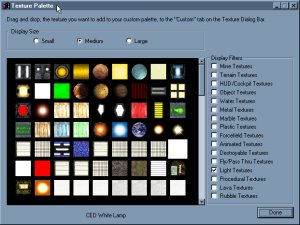 Adding lights to your room is very easy, though making the lights look good can sometimes be very hard. Lights are just a different texture used in D3Edit. You can access these textures by going into your texture list and clicking on the 'Lights' box (You don't have to un-check the 'Mine' box, but it makes the window a bit cleaner.) For now, just put the texture 'CED White Lamp' in your palette.