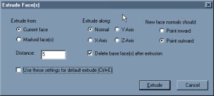 Click on the 'extrude' button and put in these settings: Extrude from current face, Extrude distance 5, Extrude along 'Normal', Normals 'Point outward', and 'Delete base face' should be checked. Double check all of these settings (it should look like the picture to the left) and click on 'Extrude'.