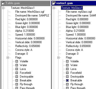 Open then branch. Change the name of the texture by dbl-clicking the name and typing over it. This is the name that will appear when you choose it from the Texture Palette. Go down to Flags and check breakable. Save the .gam file.