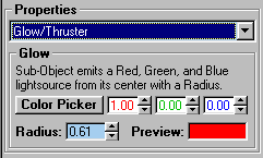 Pick the sub-model and choose Glow/Thruster from the list of properties. You can set the color by adjusting the RGB or use the Color Picker to choose from a color pallet. Use the Radius spinner to set the size |