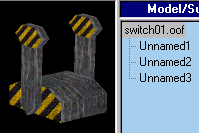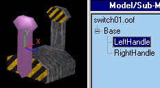 The first object is going to be a switch with 2 moving handles. Here's the orf . Download it to follow along. I've made a base and 2 handles in D3Edit. Remember! You can't ADD pieces once you're in OOFEditor so make sure everything you'll need is in the ORF. |