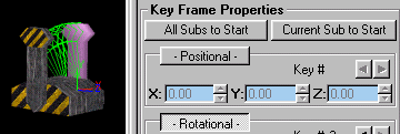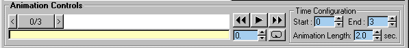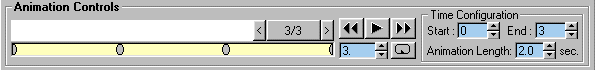 | With LeftHandle selected and the Frame Marker at 0 go to the Animation Tab and pick Rotational. This tells The oof that the sub-model has a Rotational animation key at 0. You'll see an oval appear at the left end of the Animation Bar. The oval tells you that the selected sub-model has an animation key at that location. Advance the Frame Marker by clicking the > button. The Marker should now read 1/3. Put a Rotational key there. Finish with LeftHandle by assigning a Rotational key to 2/3 and 3/3. With LeftHandle still highlighted your Animation Control should look like the one below. |
