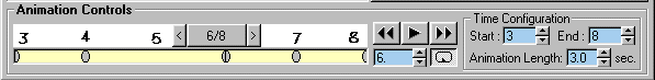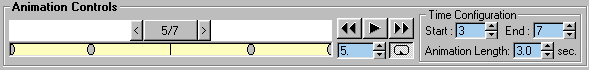 One obvious way would be to have the handles move to the first position, back to start, then to the second position: all 45 degrees per frame. This would require a key at every frame and, since it's obvious, you wouldn't learn anything. Lets try something else. First go to Time Configuration and set Start at 3, End at 7. With the Frame Marker all the way to the left, it should read 3/7. Select Lefthandle. You'll see the key marker is still at 3 all the way to the left. Add a rotation Key for LeftHandle and Righthandle at 4, and 6. Do NOT put a key at 5. At 4, set both subs animation to 45 and -45 the same as on the previous page. Skip 5. At 6 set both subs to -90 and 90 same as the previous page. At 7, where you haven't added keys yet, select "All Subs to Start". A key as added for both subs and their animation is set by OOFEditor. Put your Frame marker to 5 and your Animation Bar should look like mine below. There should be NO KEY at 5. Put the Frame Marker to 3, set the Loop button and play the animation. |
