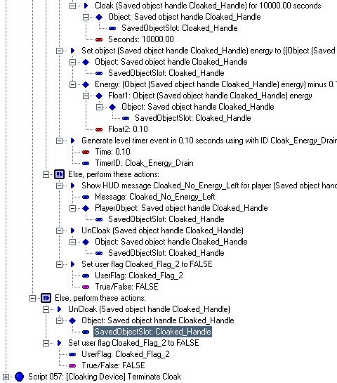 This script was not for this site, but for Skyalmian for his project "Lunar Outpost MN0012" when he needed a cloaking device for the ship just like the one in the novel Descent (although, the DALLAS screenshots are from his script for his level Space Station Kreathlan, where he employed the use of the Cloaking Device when it didn't make it into Lunar Outpost MN0019). This script is extremely advanced and not for beginners in the slightest, so everything will not be explained (it is assumed you know how to fully operate DALLAS). Skyalmian had a difficult time trying to duplicate this in DALLAS when it was given to him. This so-called tutorial will show you what should be done to create a Cloaking Device powerup that can be used by any ship and will explain in general what each script does. Overall, it should take between 30 minutes to 1 hour, depending on how well you can operate DALLAS. 01 - The very first thing you should do once in the Dallas Graphical Script Editor is open the "User Types Workshop" and create the following user types: The Cloaked_Handle is the identification of the player ship holding the device, the Cloak_Energy_Drain is for the timer used to drain the ship of energy using the Cloaking Device, the Cloaked_Flag_# are critically important for states of cloaking, and Useless is only necessary to fill in a blank space for the first script. 02 - Create these messages in the Message List (name -> text string): 03 - Create a powerup in the level with the name Cloaking_Device and put it close to if not on the first player start. Pick a good, suitable object, as people will see the model when the player holding the Cloaking Device dies. Skyalmian for his version chose the model Data Cartridge. 04 - Create a level start script that is executed upon level start. In it, "Set user flag Cloaked_Flag_1 to FALSE". 05 - Create the first script; duplicate the expanded script selected. This script automatically gives the object Cloaking Device to the nearest player's inventory at level start with the name "Cloaking Device" and with the object spewable at player death, lest the object be lost forever when the player dies. Note: if you wish, you can skip this script to have the Cloaking Device be found in the level by the player instead (in which case, delete the UserVar Useless, as it will not be needed). 06 - Create the second script; duplicate the expanded script selected. This script adds the Cloaking Device powerup to the inventory of whatever ship touches it, with the attribute of being spewable upon player death. 07 - Create the third script; duplicate the expanded script selected. This script is for when the player activates the Cloaking Device. When activated, it re-adds the device back to the inventory, lest it be lost, gives the player ship the Cloaked_Handle identification, starts the energy drain timer since the device is now On, and sets the Cloaked_Flag_#s necessary for the device's operation. 08 - The fourth script is the most difficult of them all, as this operates the Cloaking Device. This is divided into multiple pictures, as it was not possible to create a snapshot of the entire script. In the first image the title of the script is highlighted. In the subsequent images, the last line of script shown in the previous image is highlighted so as to keep track of where you left off. For example, in Stage 2, the line "True/False: True" is highlighted because that was the very last line in Stage 1. Also, in Stage 2, the windows was scrolled to the right a bit to show what one of the more lengthier lines of script does, the one that subtracts 0.10 energy from the player's ship. Even though the first main line of text is cut off (the top expandable tree line), it is still possible to know what the line would say after analyzing the script lines below it. 09 - With the most difficult script hopefully finished, there is one left. Duplicate the expanded script selected. This script turns the Cloaking Device Off when the player dies. 10 - You're finished; 6 scripts total, counting the Level Start script that sets the important flag "Cloaked_Flag_1" to FALSE. One thing you can do to tweak the script is change the "Float: 0.10" value in Stage 2 of Step #08 to a higher or lower number. The higher the number, the faster your ship's energy will drain. If you set it to 0, no energy will be lost, but that would make the timer pointless. If you know how, you can strip the timer from this script so that the Cloaking Device simply enables/disables the cloak without any loss of energy or unnecessary script code. Although, heh, no one would ever turn the silly thing off...