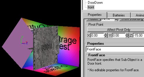 First, build and texture your door and its shell in D3Edit (The shell textures don't matter yet; you'll be able to change them after you add the door to your level). When building the door, make sure that parts you will want to move do not share any vertices with the shell or any other moving parts. Arrange the door's parts so that the door is closed and is halfway between the front and back of the shell, because D3 seems to "fix" doors that aren't at the halfway point.
