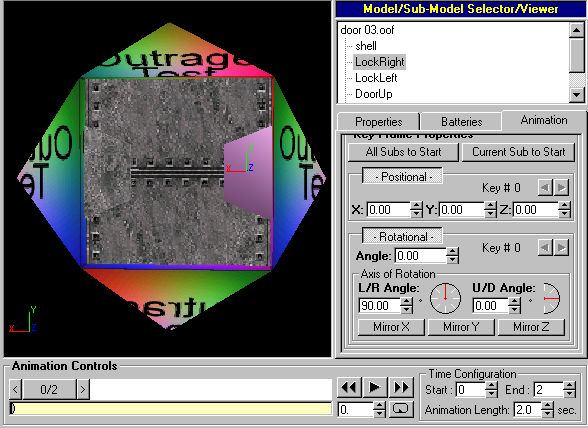 Now you can start setting animation frames for your door's various submodels. Select one of the "moving parts" submodels and click on the "Animation" tab. For each keyframe, if a submodel starts moving, stops moving, changes speed or direction, or changes the rate at which it is turning, you must select both "-Positional-" and "-Rotational-" under "Key Frame Properties." (If you don't select both of those, your door may pop open instantaneously in D3 instead of animating open.) If that didn't make sense, look at the example and it should. I'll start with the submodel called "LockRight."