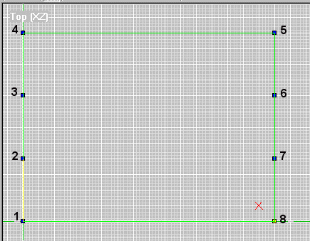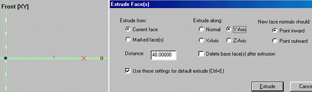 Using the mouse and the Insert key place the remaining verts exactly as in ex. d. Place them in a clockwise pattern and in numerical order (as numbered in ex. d - this is VERY important!). You may need to use the view pan and zoom functions to position the pane so that all the verts will fit in view. If you misplace a vert, just hit the delete key and start again. After you have placed the 8 verts, enter face mode (use Mode/Face or ctrl + F). Press the Insert key. A highlighted green square will appear along the marked verts - this is your first face! The green lines signify that this is also your current face. Notice that all the verts are no longer blue, or marked (not shown in ex d). Your room should measure 160 x 120 units. Since we placed our first vert at 0, 0, 0, this would mean that vert #5 should be at coordinates 160, 120 - verifying the size of the room. ex. d If your face turned out wrong, it can be deleted. In face mode, click on the face until it is outlined in green. Go to the Mark menu and select Mark/Unmark. Now click on the grid, but outside of the face. Notice that the face is now outlined in blue. This means that the face is marked and can be manipulated. Hit the Delete key and watch it disappear. Verts and faces can be marked and deleted, in their respective modes. Faces and verts can also be marked by left-click-holding and dragging a box around all faces or verts you want selected. Ok now let's rearrange the screen so that our face can be seen in all three of the 2D panes. You must click inside a pane before you can move it or edit in it. A pane is selected when the pane "title" is white (the Top (XZ) in ex. c & d and the Front (XY) in ex. b). You can see in the Front and Side views that a short purple line is sticking out of the face. This is the normal and it shows which direction the textured side of the face is pointing. Right click in the 3D view and select Center Current Face. If nothing happens, make sure that the face is selected in the 2D panes (green outline). When you have the face in the 3D view, right click again and select Textured with Wireframe. Use ctrl + left mouse to rotate the face. Note that one side has a colorful texture, while the other is just black. Extrude ex. f The Extrude Face(s) dialog box is shown in ex. f. Fill in the options so that it looks like ex. f. The first option, Extrude From:, is where you select which face(s) you want to extrude. For a face to be current it must be outlined in green. You can also mark one or more faces and extrude from these. We only have one face, so the choice is pretty easy :) Distance is the number of units we want our extrusion to span. Our extruded room will be 40 units tall. This number can be negative for extruding the opposite direction. Extrude Along is the axis along which you want your extrusion to follow. Determining the extrude axis can be tricky for the novice 3D modeler. We made our face using the Top view. The Top view only represents two dimensions, X and Z - X = horizontal, Z = vertical. We don't want to extrude in either of these directions. Since this face will end up being our floor, we know that we need to stretch the room away from this face. The extrude in this view would come towards you and out of the screen 40 units, which is, of course, impossible. Since we know we can't extrude along either axis in this view, and since this view shows X and Z, then by process of elimination we know that Y is the axis to extrude along. To prove it, look at the Front view pane. This shows the X an Y views ex f. We are now looking at the "floor" of our room from floor level. Notice the normal (purple line) is pointing up the Y axis - that's the textured side of the face. We will extrude in this direction in order to make our room. New Face Normals determines which direction the textured side of you face will point. They should point inward so we can see the walls from inside the room once extruded. Delete Base Face after extrusion will delete the face you started with once the extrude is complete. Since our room needs a floor, we'll leave it unchecked. Use Settings as Default can be checked or not, doesn't matter for us. Once everything is set properly, click the Extrude button. The result should resemble ex. g. ex. g Congratulations - you have successfully constructed your first D3 room!!! Save this room now and call it "room1.orf" - you will use this room in the next tutorial. D3Edit has a nasty habit of crashing as of this writing...you can't save too often. If you view the room in the 3D pane as textured, you will see that the room has been "painted" in that butt-ugly multicolored pattern. We will fix this in the next lesson. For now, celebrate the fact that you have