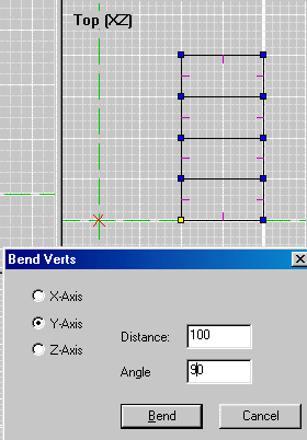 Bend verts window - these numbers can be very tricky. I'll describe them briefly now. At the end of this lesson I'll discuss these functions in more depth. Axis is the axis-pole that the bend will wrap around. In ex. c, X = horizontal and Z = vertical. You are therefore viewing the tunnel along the Y axis, straight down at the tunnel. This is the pole around which our tunnel will bend - the Y axis. Distance should be set to the length of the section to be bent. Our tunnel is 100 units long...enter 100 here. Negative numbers may also be entered here for different results. Angle is the amount of bend you want your tunnel to make. For now use a safe-and sane 90 degrees :o)