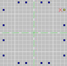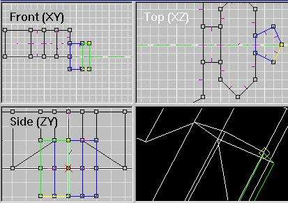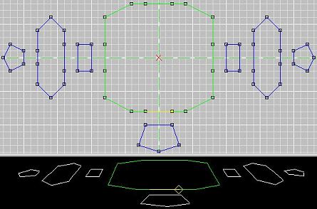 Sometimes you just can't make the shell you want with a single floor or wall face. So you have to use multiple faces. This is a dangerous process if you don't know what you are doing, in the sense that you can create T-Joints left and right, and fill your level with errors. You always want all your room shells to be airtight and error free to eliminate the risk of crashes or other problems during games. So let's go through the process of making an error-free shell with multiple extrusions. You have to plan carefully so that you don't create any T's, which will leave holes in your shell. Check out this vertex pattern. ![]() Now I'm going to make the other faces separately, just to show the pieces and how you have to match up the verts and the edges. ![]() The reason you have to do so many of these faces to get this room shape is because you cannot have any concave faces. So you have to think of the shape you want, then break down the floor into as few faces as possible without having any of them be concave. Also note the yellow edge on the current face: that edge HAS to match exactly with the pentagon face's edge, because that will be a shared edge on the floor, and unless its an exact match, you've got T's and a bad shell. Now I'm going to move all the faces together into their proper places and extrude. (On another note, see the grid? That's a 10 grid, not a 5. You can zoom out on the grids, by panning with the mouse, if you need to see your whole room, and you can zoom in really close if you are working with tiny grids and can't see what you are doing.) In current versions of the editor, you can extrude from all these faces at one time, by clicking "Extrude from: Marked Face(s)" in the extrude dialog. Then bang, it will extrude them all in one shot, to the same length. If you are still working with 0.9 beta version, you will have to extrude them one at a time. Here's a look after extruding. ![]() Do you see the block on the far right? It extruded DOWN instead of up. Oooops. Don't let this happen to you! Make sure you always lay your floor verts in a COUNTER-CLOCKWISE circuit when making floor faces, so your normals always point up. And check before you extrude to make sure you remembered, and that no normals are pointing downward. If by chance you do have one or more pointing downward, then you've got to unmark ALL the faces, mark the ones that are facing wrong, flip them, then remark all the floor faces. Yum. It's also a good idea to NOT "combine" your verts prior to extruding. There's plenty of time to do that once the shape is right. If you combine the verts, you can't move the extruded blocks around independently. They will have been attached, and moving one will cause distortion in others, like this: ![]() Now in current editor versions you can move marked faces around in face mode. So that move COULD have fixed the problem you see here IF the verts hadn't been combined. So don't go removing duped verts until the shell is done, THEN do it. And don't forget to! You can cause massive errors if you fail to combine verts to seal up those shared edges! Now let's look at the room as it is meant to be: ![]() We are not quite done yet. There are some faces between the segments that need to be removed to open this thing up into a single area. You can do this best in top view. First make sure you are in face mode, then unmark all faces, then use the mouse to click and drag over JUST the faces you need to remove. Do it along each seam, one seam at a time. When you have all the seams marked, it should look something like this: ![]() Make sure you didn't accidentally mark any of the soon-to-be shell faces. You only want to delete the seams between extruded segments. Once they are all marked, press the delete key or choose Delete from the Edit menu. NOW your shell is done, and you should Remove Extra Verts to seal all the edges. And there you go: a non-bland non-boxy room made entirely with Extrude. ![]() Texture as desired. Then your shell is complete and error free, and you can begin to populate it with nonshell faces. ------------------------------------------ One other note: This example room is *JUST* an example. I would not actually DO this layout this way if I wanted to use this in a level. Rather, I would have this be three rooms, since those wing areas on the sides will not have line of sight to most other rooms. Those should be rooms unto themselves. So this example room should actually be three rooms: the middle and the two wings. And this would save you a little time, as well, because you could do just one of the wings as its own room and use that room twice when you assemble all your ORFs to make the D3L. Now that's not the main reason to break this into three rooms. The main reason is because that would be best in terms of the Vis table and the game engine, and optimizing your level's performance. But the fact that it would also take less work is a nice bonus. I hope this lesson has been valuable in showing you how you can use extrude to do more than make simple boxy rooms, as well as how to do it without creating errors. Next lesson: multiplanar extrusions. More to come... ADDENDUM - Texture Alignment With the 0.9 beta editor, texture alignment is a tedious process. You will have to align the faces manually, one at a time, if you need to realign things once you're done extruding. One thing you can do in this case is a simple step by step process to cut down on the work: 1) Select a face to align 2) Click the middle button to reset the face to "default UVs" (this eliminates the warpy twisty effect you get when you move the verts, or when you bend - if you don't want the textures bent with the verts, you have to reset them afterward). 3) Align the texture, eyeballing it in the 3D view in textured rather than wireframe. Take note of the U and V numbers. 4) Go to a similar face that needs to be aligned the exact same way, reset UVs with that middle button, then enter the numbers from